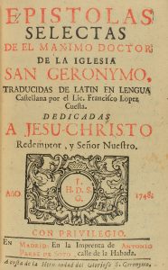 .1748.. LIBRO: .(HUMANIDADES).. .GERONYMO:. .EPISTOLAS SELECTAS DE EL MAXIMO DOCTOR DE LA GILESIA SAN GERONYMO, TRADUCIDAS DE LATIN EN LENGUA CASTELLANA.. Trad. Francisco Lopez Cuesta. Madrid: Imp. Antonio Perez de Soto, 1748. 8º menor. 8 h. + 546...