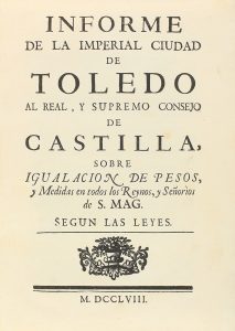 .1758.. LIBRO: .(PESOS-MEDIDAS).. .INFORME DE LA IMPERIAL CIUDAD DE TOLEDO AL REAL, Y SUPREMO CONSEJO DE CASTILLA, SOBRE IGUALACION DE PESOS, Y MEDIDAS EN TODOS LOS REYNOS, Y SEÑORRÌOS DE S. ,AG. SEGUN LAS LEYES.. Madrid: Oficina Joachin Ibarra,...