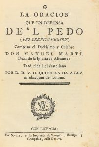 .1785 ca.. LIBRO: .(ESCATOLOGÍA).. .MARTÍ, MANUEL:. .LA ORACION QUE EN DEFENSA DE´L PEDO (PRO CREPITU VENTRIS) COMPUSO... TRADUCIDA AL CASTELLANO POR D. R. V. O. QUIEN LA DA A LUZ EN OBSEQUI DEL COMUN.. Sevilla: Imp. de Vazquez, Hidalgo, y...