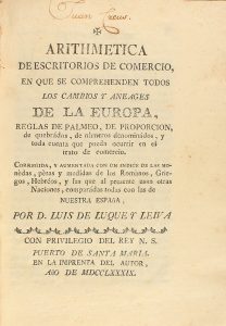 .1789.. LIBRO: .(CONTABILIDAD).. .LUQUE Y LEIVA, LUIS DE:. .ARITHMETICA DE ESCRITORIO DE COMERCIO, EN QUE SE COMPREHENDEN TODOS LOS CAMBIOS Y ANEAGES DE LA EUROPA. REGLAS DEL PALMEO, DE PROPORCION, DE QUEBRÁDOS, DE NÙMEROS DENOMINÁDOS, Y TODA...