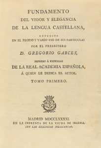 .1796.. LIBRO: .(LINGÜÍSTICA).. .GARCÉS, GREGORIO:. .FUNDAMENTO DEL VIGOR Y ELEGANCIA DE LA LENGUA CASTELLANA.. Madrid: Imp. de la Viuda de Ibarra, 1791. 2 tomos en 1 vol. 8º mayor. I: 2 h. + XXXII+288 p. II: portada+ XXXII+324 p. Enc. en...