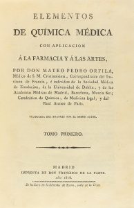 .1818.. LIBRO: .(CIENCIAS).. .ORFILA, MATEO PEDRO:. .ELEMENTOS DE QUÍMICA MÉDICA CON APLICACION Á LA FARMACIA Y Á LAS ARTES.. Madrid: imp. de don Francisco de la Parte, 1818. 2 vol. 8º mayor. I: XVI-554 p. (la página 429, es desplegable)+ 12...