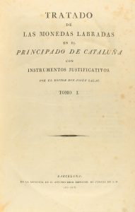 .1818.. LIBRO: .(NUMISMÁTICA).. .SALAT, JOSE:. .TRATADO DE LAS MONEDAS LABRADAS EN EL PRINCIPADO DE CATALUÑA CON INSRUMENTOS JUSTIFICATIVOS. POR EL DOCTOR.... Barcelona: imp. de Antonio Brusi, 1818. 2 tomos en un volumen 4º mayor. I: XVII p. (1 h....