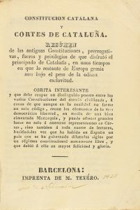RESTANTE DE EUROPA GEMIA AUN BAJO EL PESO DE LA ODIOSA ESCLAVITUD.. Barcelona: Imprenta de M. Texero, 1835 mes de Nobiembre [año y mes manuscrito sic. de la época]. 8º menor. 48 p. Cubiertas de época de papel. Edición original de extraordinaria rareza. Son contados los ejemplares conservados de esta ´Constitución Catalana´, que apareció anónima pero estudios muy recientes saben fue redactada por Ramon López Soler (Manresa, 1799 - Madrid, 1836). Palau Ribalta y Haro, Jaume. Constitución catalana y Cortes de Cataluña. Excerpta vuitcentista de Peguera, a càrrec de Ramon López Soler. [Revista de Dret Històric Català, 2 (2002), p.11-119].