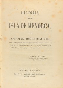 .1874.. LIBRO: .(LOCAL-MENORCA).. .OLÉO Y QUADRADO, RAFAEL:. .HISTORIA DE LA ISLA DE MENORCA.. Ciudadela de Menorca: Tip. S. Fábregues, 1874. 2 tomos en un vol. en 8º mayor. I: 647 p. y II: 679 p., 4 h. Ligera señal de óxido. Enc. en media piel,...