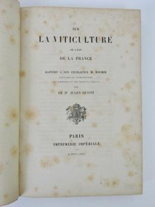 GUYOT (J.): Deux ouvrages reliés en 1 vol. in-8 demi-chagrin rouge d'époque (rousseurs, papier un peu bruni): 1/Sur la Viticulture de l'Est de la France. Imprimerie Impériale, 1863. Edition originale. Envoi. 2/Sur la viticulture du Nord-Est de la France. Imprimerie Impériale, 1864. Edition originale. Envoi. Le médecin Jules Guyot (1807-1872) doit surtout sa réputation à ses études viticoles qui ont opéré en France une véritable révolution. De 1841 à 1850 à Châlons-en-Champagne, puis de 1850 à 1858 à Sillery, il fut employé par l'entreprise de vins de Champagne Jacquesson où il produisit de nombreuses inventions. Il décrivit son expérience de viticulteur, puis de vinificateur chez Jacquesson, dans son manuel de viticulture publié à partir du journal de la plantation d'un vignoble dans une revue en plusieurs épisodes, puis en volume au début des années 186. De là provient sa réputation et la mission qui lui fut confiée par le ministère de l'agriculture de visiter tous les vignobles de France, à une époque où l'on venait de signer un traité de commerce avec l'Angleterre. Il fallait alors mettre les différentes régions en mesure d'augmenter leurs exportations vers ce pays gros importateur de vins.