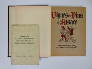 Collectif - Vignes et vins d'Alasace. Colmar, 1950. In-4 toile bordeaux éditeur. Nombreuses illustrations. On joint une plaquette brochée: Congrès International de la vigne et du vin à Kreuznach-les-Bains. 1939. (rouss.)