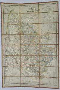 PAGNAU: Carte du Département de la Gironde. Fillastre frères, 1860. Carte composée de 24 panneaux imprimés en couleurs et montés sur toile, repliée et placée dans un étui de toile bordeaux moderne. Belle carte viticole de la Gironde.