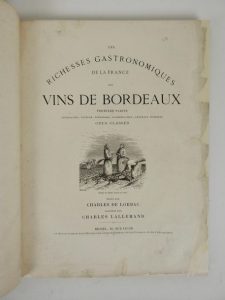 LORBAC (Ch. De) et LALLEMAND (Ch.): Les richesses gastronomiques de la France. Les vins de Bordeaux. Première partie: Généralités, culture, vendanges, classification, châteaux vinicoles, crus classés. Hetzel, s.d. In-folio demi-chagrin noir moderne (page de titre réparée dans les margew, qq autres ff. avec petites et discrètes restaurations). Une carte en couleurs, planches hors texte et gravures dans le texte.