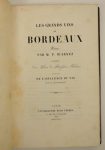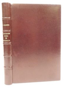 BIARNEZ (M.P.): Grands vins de Bordeaux. Précédés d'une leçon du professeur Fabrius intitulée De l'influence du vin sur la Civilisation. Paris, Plon Frères, 1849. In-8 plein chagrin prune moderne, dos à nerfs, , gardes de soie rouge, tranches dorées (Bontaz). (petites rousseurs et mouillures angulaires). Edition originale illustrée de 3 titres et 34 planches hors texte. Bon exemplaire de ce recueil de poèmes sur les vins de Médoc et le vin blanc de Bordeaux, précédés d'un exposé sur "l'influence du vin sur la civilisation" extrait d'un cours d'?nologie donné à Bordeaux par le Prof. J. Babrius (pseudonyme du Dr. Arthaud).