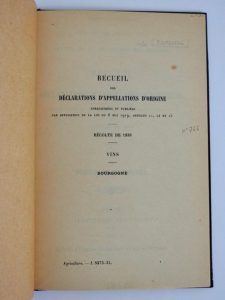 Recueil des déclarations d'appellation d'origine, récolte de 1930. Région de Bourgogne. Imprimerie Nationale, 1931. Plaquette in-8 bradel de cartonnage bordeaux moderne, couv. Cons.