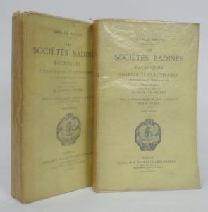 DINAUX (A.): Les Sociétés badines, bachiques, chantantes et littéraires. Leur histoire et leurs travaux…Bachelin-Deflorenne, 1867. 2 vol. in-8 brochés, couv. Imp. (légères rouss.). Un portrait gravé à l'eau-forte par Staal. Edition posthume revue et classée par Gustave Brunet. Ouvrage de référence sur le sujet. Bel exemplaire.