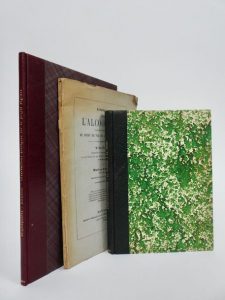ALCOOLISME - Réunion de 3 vol.: -Gabriel: Essai sur l'alcoolisme considéré principalement au point de vue de l'hygiène publique. Montpellier, Cristin, 1866 in-8 broc. (dos passé et fendu), envoi de l'auteur; -Bourguignon (L.): La guerre à la vigne. destruction d'une richesse nationale, alcoolisme et lymphatisme. Strauss, 1903. bradel de demi-maroquin vert moderne, couv. cons.; -desjonquieres-Mambour: Monopole de l'alcool. Observations critiques sur le projet Alglave. Brière, 1897. In-8 bradel de demi-maroquin prune moderne, couv. cons.