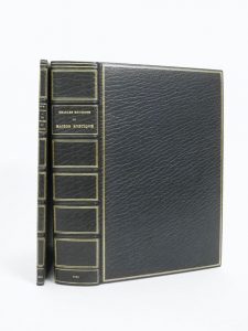 ESTIENNE (Ch. Et LIEBAUT (J.): L'Agriculture et maison rustique…Edition dernière revue et augmentée de beaucoup...suivi de: Clamorgan (Jean de): la chasse au loup...Lyon, Jacques Du Puis, 1586. 2 vol. plein maroquin vert , dos à nerfs orné de filets dorés, plats encadrés de 2 filets dorés, dentelle int., tranches dorées, les 2 vol étant placés dans une boîteà dos de maroquin vert (Laurenchet). L'ouvrage est illustré de figures sur bois qui comprennent le plus souvent un paysage en arrière plan. On notera deux belles planches à pleine page du boeuf et du cheval ainsi que divers plans de jardins. La "Chasse au loup" de Jean de Clamorgan, fut toujours jointe à la "Maison rustique" à partir de 1566. Son ouvrage est illustré de 14 figures sur bois: scènes de chasse, empreintes d'animaux, etc... Superbe exemplaire où la seconde partie, le Traité de la chasse au loup, a été reliée à part. L