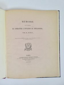 [MALADIES de la VIGNE] Réunion de 7 plaquettes in-4 reliées bradel de demi-maroquin bordeaux moderne, couv. Cons.: 1/Dumas: Mémoire sur les moyens de combattre l'invasion du phulloxera, 1874; 2/Dumas: Communication relative à la destruction du Phylloxera...1874; 3/Académie des Sciences: Commission du Phylloxera, 3 décembre 1874; 4/Collectif: Rapport sur les études relatives au Phylloxera, 1873; 5/Duclaux: Etudes sur la nouvelle maladie de la vigne dans le Sud-Est de la France, 1874, 9 cartes h.t.; 6/Faucon: Mémoire sur la maladie de la vigne et sur son traitement par le procédé de la submersion, 1874; 7/Cornu: Etudes sur la nouvelle maladie de la vigne. 1874. 3 planches en couleurs h.t.