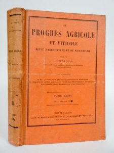 COLLECTIF: Le Progrès agricole et viticole. Revue d'agriculture et de viticulture dirigée par L. Degrully. Montpellier, entre 1892 à 1938. Réunion de 87 vol. In-8 reliés soit en cartonnage d'époque, soit en toile d'époque ou moderne + qq demi-basane. Très Importante réunion de cette revue illustrée de belles planches en couleurs.
