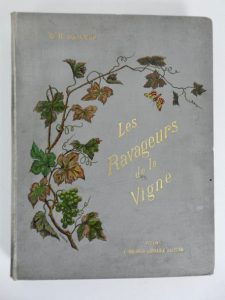 JOLICOEUR (Henri): Description des ravageurs de la vigne, insectes et champignons parasites, représentés en couleurs avec indication des meilleurs moyens à employer pour les combattre. Reims, Michaud et Paris, Doin, 1894. In-folio pleine percaline grise éditeur, premier plat orné d'une composition personnalisée, (dos passé, coiffes et coins usés). Ouvrage illustré de 20 belles planches h.t. en chromolithographie. EDITION ORIGINALE DE CET OUVRAGE RECHERCHE sur les parasites animaux et végétaux de la vigne.