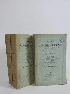 GUYOT (J.): Etude des vignobles de France pour servir à l'enseignement mutuel de la viticulture et de la vinification française. Masson, 1876. 3 vol. in-8 brochés (cachet sur les couv., dos un peu passé, rares rouss.). Une carte en couleurs et nombreuses illustrations dans le texte. Bon exemplaire. Le médecin Jules Guyot (1807-1872) doit surtout sa réputation à ses études viticoles qui ont opéré en France une véritable révolution. De 1841 à 1850 à Châlons-en-Champagne, puis de 1850 à 1858 à Sillery, il fut employé par l'entreprise de vins de Champagne Jacquesson où il produisit de nombreuses inventions. Il décrivit son expérience de viticulteur, puis de vinificateur chez Jacquesson, dans son manuel de viticulture publié à partir du journal de la plantation d'un vignoble dans une revue en plusieurs épisodes, puis en volume au début des années 186. De là provient sa réputation et la mission qui lui fut confiée par le ministère de l'agriculture de visiter tous les vignobles de France, à une époque où l'on venait de signer un traité de commerce avec l'Angleterre. Il fallait alors mettre les différentes régions en mesure d'augmenter leurs exportations vers ce pays gros importateur de vins.