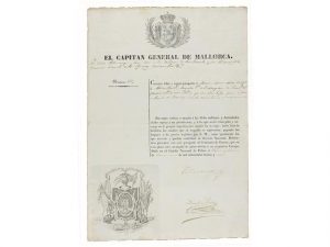 1838. (MALLORCA). EL CAPITAN GENERAL DE MALLORCA. PASAPORTE EN FAVOR DE ANTONIA MARIA MAS MUJER DE ANDRES PORCELL SARGENTO. 1 h. mitad impresa, mitad manuscrita. Escudo heraldico grabado por Vallejo.