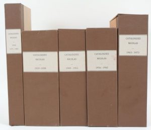 CATALOGUES NICOLAS : importante réunion de catalogues et de plaquettes, placés dans 5 boîtes à dos de toile marron: Catalogues et plaquettes entre 1928 et 1981.