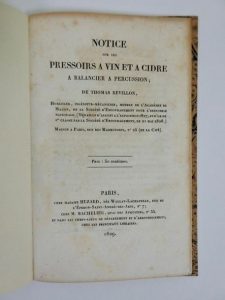 REVILLON (Th.): Notice sur les pressoirs à vin et à cidre à balancier à percussion de Thomas Revillon…Huzard et Bachelier, 1829. Plaquette in-8 cartonnage marbré moderne, 28 pp. (qq légères rouss.)