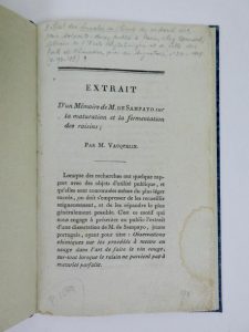 VAUQUELIN: Extrait d'un mémoire de M. de Sampayo sur la maturation et la fermentation des raisins. 1807. Plaquette in-8 bradel de demi-veau bleu moderne, 7 pp. (mouillure marginale). Rare.