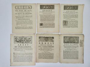 DOCUMENTS - Réunion de 6 pièces du XVIIIe siècle concernant le vin: Arrêts du Parlement, Edit du Roy, Arrêt du Conseil d'Etat, , etc…