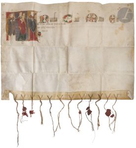 Grand document sur parchemin, gouache et tempera, encre brune, texte (textualis formata) tracé à la mine de plomb, au bas du document douze (12) lacs avec sceaux pendants de cire rouge, certains sceaux manquants, d’autres lacunaires.