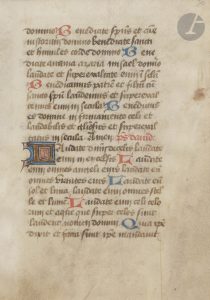 [ENLUMINURE]. — Feuillet extrait d’un livre d’heures (Psaumes de la pénitence) — En latin, fragment de manuscrit enluminé sur parchemin. France, vers 1475 — Dimensions : 110 x 160 mm