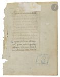 Au recto réglure à la pointe sèche visible ; feuillet rogné un peu court en hauteur, un côté du feuillet avec déchirures ; marge de droite avec petits manques de parchemin ;