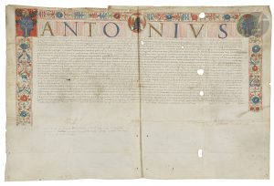 [ENLUMINURE]. — Charte enluminée avec armes. Lettres de nomination accordées à Nicolas de Colle (de Lucca) par le Cardinal Antonio Ferrerio della Rovere — Gouache, encre et or bruni sur parchemin — Italie, Prieuré de San Giovanni Spinellis...