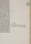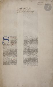 Exemplaire entièrement rubriqué en rouge et bleu et comprenant sur chaque feuillet des notes manuscrites de l’époque précisant le contenu du texte. On connaît l’origine de ces notes, écrites par un moine de l’abbaye de Saint-Magne de Ratisbonne en Allemagne, comme l’indique ces trois lignes écrites en tête du premier feuillet : « Ad sanctu(m) Magnu(m) Ratisbone // p(er)tinet liber iste lector bone // omnibus est scitu(m) ne contogat raptum », signifiant : « Bon lecteur, ce livre appartient à Saint-Magne de Ratisbonne. Que cela soit connu de tous afin qu’il ne soit pas volé ».Outre ces indications, on trouve également quelques annotations de l’époque dans le texte. Il manque le premier feuillet blanc remplacé au moment de la reliure par un autre feuillet sur lequel a été calligraphié le titre du livre en caractères gothiques sur quatre lignes, orné d’une lettrine peinte en rouge.Frottements d’usage, légères fentes aux mors. Mouillures claires touchant essentiellement les marges supérieures et intérieures, atteignant parfois le texte, et par endroits dans les marges inférieures.Provenance : Abbaye Saint-Magne de Ratisbonne, avec ex-libris manuscrit sur le premier feuillet. - Jean-Baptiste Colbert de Beaulieu, avec ex-libris.