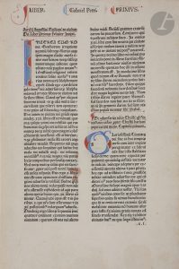 Exemplaire complet, sauf des feuillets blancs a1 et D10, entièrement rubriqué en rouge et bleu et comprenant plusieurs notes à l’encre de l’époque. Plusieurs de ces notes ont été malheureusement coupées en marge par le relieur.