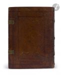 froid sur ais de bois, plats ornés d’un encadrement fait de filets et d’une roulette à motif de fleurs de lys, entourant un décor de compartiments ovales contenant en leur centre un motif de chardon, dos à nerfs (reliure de l’époque).