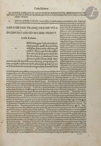 Troisième édition incunable très rare de la Vie des douze César de Suetone avec les gloses de l’humaniste et historien Marco Antonio Coccio Sabellico (1436-1506). Elle succède à celle donnée à Venise par Battista Torti en 1490 et celle imprimée par Ulric Scinzenzeler à Milan en 1491.