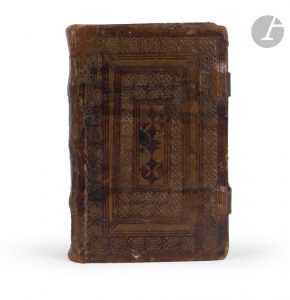 car. goth. sur deux col. de 40 lignes. — Veau havane sur ais de bois, plats ornés d’un décor à froid composé de filets triples droits et obliques et de fers à motifs d’entrelacs en encadrement, fers en losange formant deux croix jointes par un autre fer en losange au centre, fermoirs en cuir et laiton ciselé, dos à nerfs orné de filets à froid, tranches lisses (reliure de l’époque).