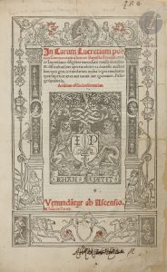 IL S’AGIT DE LA PREMIÈRE ÉDITION DONNÉE EN FRANCE du De Rerum natura (De la nature des choses) de Lucrèce, publiée par l’humaniste orléanais Nicolas Bérauld (1473?-1550?), ami notamment d’Érasme et de Guillaume Budé, avec le commentaire du philologue humaniste italien Giovanni Battista Pio (vers 1475-vers 1540), ici en seconde édition.