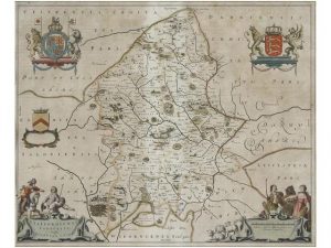 1645. (REINO UNIDO). BLAEU: STAFFORDIENSIS COMITATUS VULGO STAFFORD SHIRE. Amsterdam, 1645. Grabado al cobre coloreado de época. 43X52 cm. plancha. Amplios margenes. Papel levemente oscurecido.