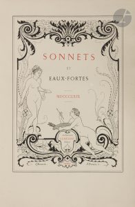 SONNETS ET EAUX-FORTES. — Paris : Alphonse Lemerre, 1869. — In-folio, 358 x 295 : titre, (46 ff.), 42 planches. — Demi-maroquin havane à coins, filets dorés, dos à nerfs orné, tête dorée, non rogné (reliure de l’époque).