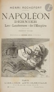 ROCHEFORT (Henri). — Napoléon dernier. — Les « Lanternes » de l’Empire. — Paris : Librairie anti-cléricale, [1880-1884]. — 3 tomes en un volume in-8, 270 x 169 : 334 pp., (1 f.) ; 339 pp. ; 532 pp. — Demi-basane rouge, dos à...