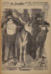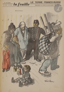 AXA (Zo d’). — La Feuille. — Paris, 6 octobre 1897- 28 mars 1899. — 25 numéros in-folio, 450 x 315. — Demi-veau violet, haut du premier plat orné d’un motif doré et bleu clair représentant un vendeur dont les journaux...