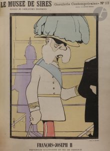 ♦ Rarissime suite complète des 13 feuilles de caricatures comportant chacune au recto une grande caricature en couleurs d’Auguste Roubille (1872-1955), représentant autant de souverains différents, à savoir :