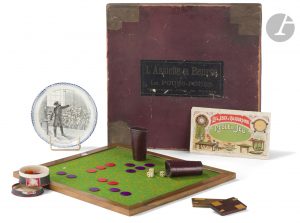 ♦ Très rare boîte de deux jeux de société éditée vers 1907. Elle contient un plateau à deux faces, deux cornets, une boîte avec 4 dés, 41 jetons violets, rouges et orange et 2 jetons rectangulaires, violet pour l’un et jaune pour l’autre, ainsi que deux compteurs de points en bois.Ces éléments permettent de jouer au jeu de Pouss-Pouss et à celui de L’Assiette au beurre, dont les règles sont collées à l’intérieur de la boîte.