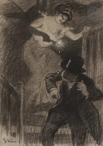 Jules Alexandre GRUN (1868-1934) — La Bougie, 1903 — Fusain et rehauts de gouache. — Signé en bas à gauche.Dessin paru dans l’Assiette au Beurre, n°104 du 28 mars 1903. — Petite déchirure en haut de la feuille.Cadre.À vue : 40 x 28,7 cm