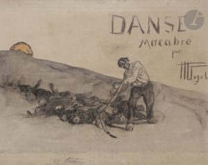 Hermann VOGEL (1856-1902) — Danse macabre, 1902 — Encre, lavis d’encre et crayon gras. — Signée et titrée dans la composition. — Dessin paru dans l’Assiette au Beurre.— Cadre. — 39 x 49,5 cm
