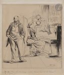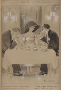 Jehan TESTEVUIDE (1873-1922) — La Coquette aux pieds sensibles, 1910 — Encre et rehauts de gouache sur traits de crayon. — Signée, datée et légendée. — Cadre. — À vue : 33 x 22,5 cm