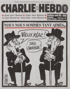Jean Cabut, dit Cabu (1938-2015), fut l’un des dessinateurs et des caricaturistes les plus doués de sa génération ainsi que l’un des plus connus et des plus attachants. Il collabora aux principales revues satiriques des années 60 à 2010, parmi lesquelles L’Enragé, Hara-Kiri hebdo, Charlie Hebdo, Le Canard enchaîné, etc. Militant pacifiste, il fut aussi bien auteur de dessins engagés que caricaturiste populaire dans des émissions pour enfants sur les chaînes publiques.