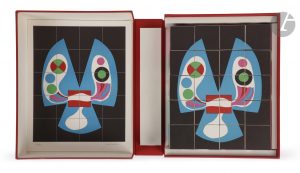Livre-objet très rare composé de 6 lithographies originales numérotées et signées par le peintre cubain Jorge Pérez CASTAÑO (1932-2009), chacune quadrillée et tirée sur les presses de Michel Cassé, et de 20 cubes puzzles illustrés en couleurs destinés à reproduire les lithographies, le tout présenté dans un emboîtage de Bernard Duval.