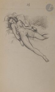 Exemplaire d’artiste, un des 16 sur japon, enrichis d’une double suite des gravures, d’un croquis original et d’un cuivre.