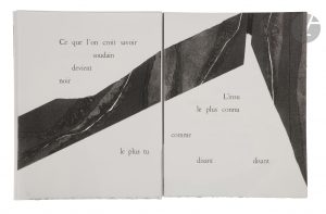 GUITET (James) - BENOÎT (Pierre-André). — Quoi. — Alès, Vaurargues : PAB, Été 1987. — In-4, (14 ff. 2 premiers et 2 derniers blancs), couverture illustrée. — En feuilles, couverture rempliée, sous emboîtage de daim gris orné...